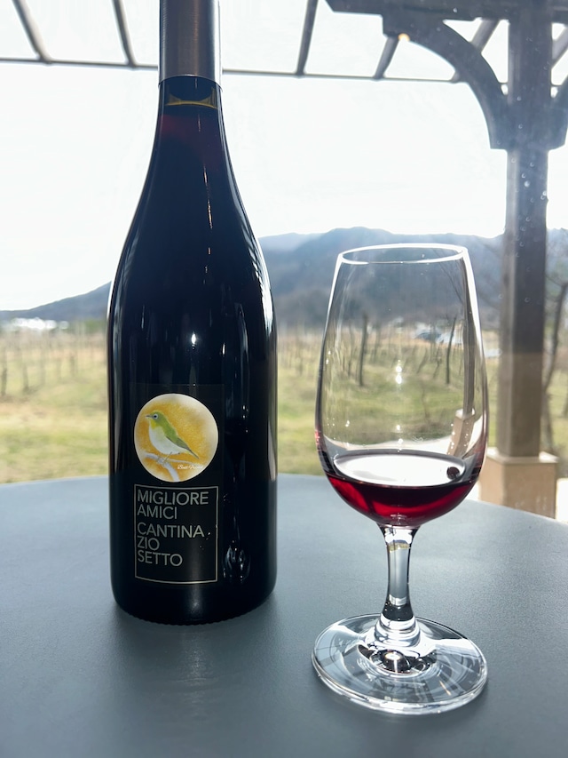 〇ミリオーレアミチは近年お付き合いの始まった生産者のブドウで造るラインナップ、イタリアワインへの憧憬と尊敬を込めます。言葉の意味はイタリア語で”親しいお友だち”。アイキャッチはメジロ。仲良く羽繕いする様子から目白押しの語源にもなります。国内で希少なイタリア品種に取り組む各地の生産者との連携を紹介していければと思っています。羽根の黄緑色は奥州でははじめましての色ですね。どうぞよろしくお願いいたします。 「サンジョベーゼ/メルロー2022 /ミリオーレアミチ(赤)」 ◯品種:サンジョベーゼ100%、メルロー2022 ◯長野県須坂市:佐藤果樹園産ブドウ、山形県産ブドウ使用 ◯アルコール分:10% ◯容量:750ml ◯JANコード:4562433691096 ◯生産本数: 本 アイキャッチ:メジロ 英名:Warbling white-eye 伊、トスカーナで有名なサンジョベーゼを使用したワイナリー初の赤ワインです。遡ること10年以上前、カーブドッチ研修期間中に運よく、サンジョベーゼとメルローの相性のよさを経験させていただきました。京都・丹波ワインさんからご縁をいただいた佐藤さんがこの品種に挑戦中でアリアニコに次いでオファーをいただきました。サンジョベーゼでワインを造るなら同量の良質なメルローの確保は必須だなとすぐに発想することができた。運よく2020年から良質なメルローの調達が始まっていたので二つ返事でスタートを切った。2022年ヴィンテージは赤ワインに初トライなのでサンジョベーゼは多めで補糖なし、1年間フレンチオーク樽で熟成させました。疑心暗鬼でのスタートでしたが、微かに、いや遥か遠くに感じるスーパータスカンの姿・・・。目論見は間違えなかったと確信したものです。ワインの総生産量に対して徐々に瓶詰を実施。今回のワインは2025/9/17に瓶詰した649本からのリリースとなります。 弊社の看板になり始めた赤ワイン=ネッビオーロとバルベーラ。ピエモンテ州原産品種のためか、彼の地の郷土料理ブラザート(牛肉の赤ワイン煮込み)やヴィッテロトンナート(茹で牛肉のツナソース添え)など肉に加水した料理といただく地方性。一方のサンジョベーゼの故郷であるトスカーナは塩味の強い料理、また豪快に牛肉を焼き上げ、肉から水分を抜く料理ステーキ=ヴィステッカが定番の組み合わせ。地域性の違いがワインの味わいにも微妙に表れて興味深いです。
