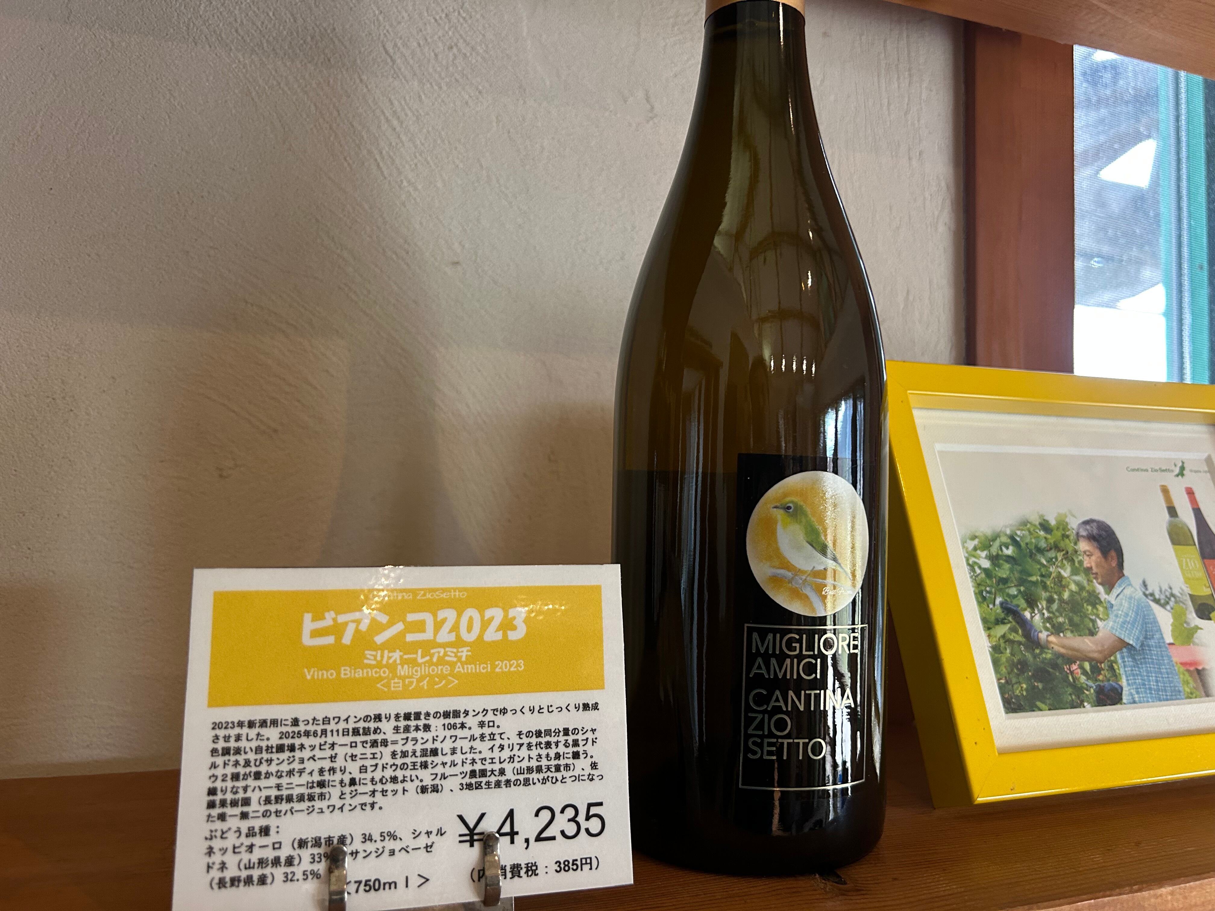 〇ミリオーレアミチは近年お付き合いの始まった生産者のブドウで造るラインナップ、イタリアワインへの憧憬と尊敬を込めます。言葉の意味はイタリア語で”親しいお友だち”。アイキャッチはメジロ。仲良く羽繕いする様子から目白押しの語源にもなります。国内で希少なイタリア品種に取り組む各地の生産者との連携を紹介していければと思っています。羽根の黄緑色は奥州でははじめましての色ですね。どうぞよろしくお願いいたします。