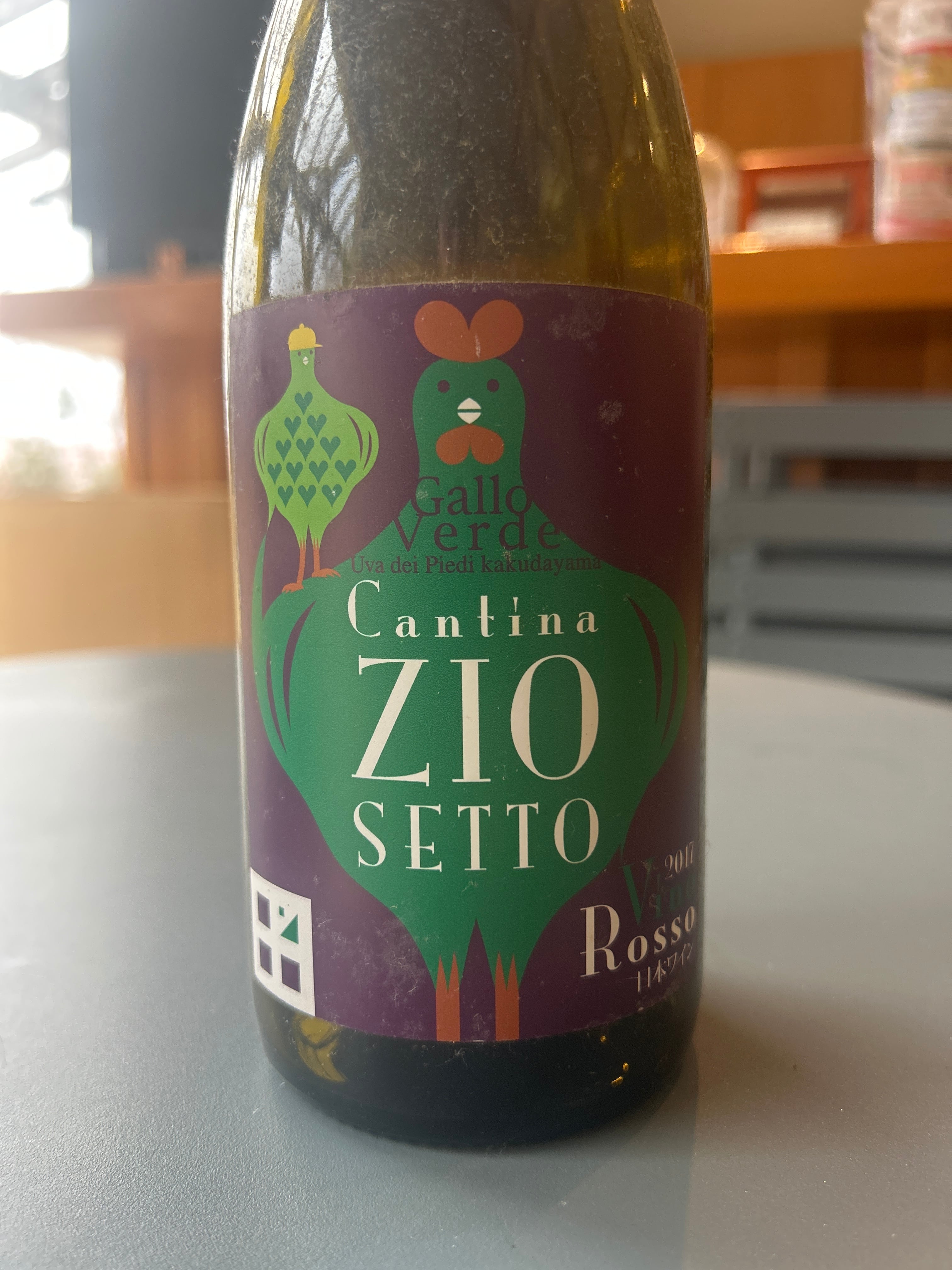 新潟市在住、石川経治さんによるもの。2014年からは地元の小学校と収穫を始めたことを記録するために雄鶏の右肩に小さなニワトリがのる。黄色い帽子は手伝ってくれた小学生を表し、胸のハートの数は6年生の生徒数を表す。作業の御礼として8年後(12歳+8年=20歳)にひとり1本のワインをお渡しする。伝統的なワイン産地が地元から製造や栽培に関わる人材を輩出するように、将来この地もそうなって欲しいとの願いを込めた。