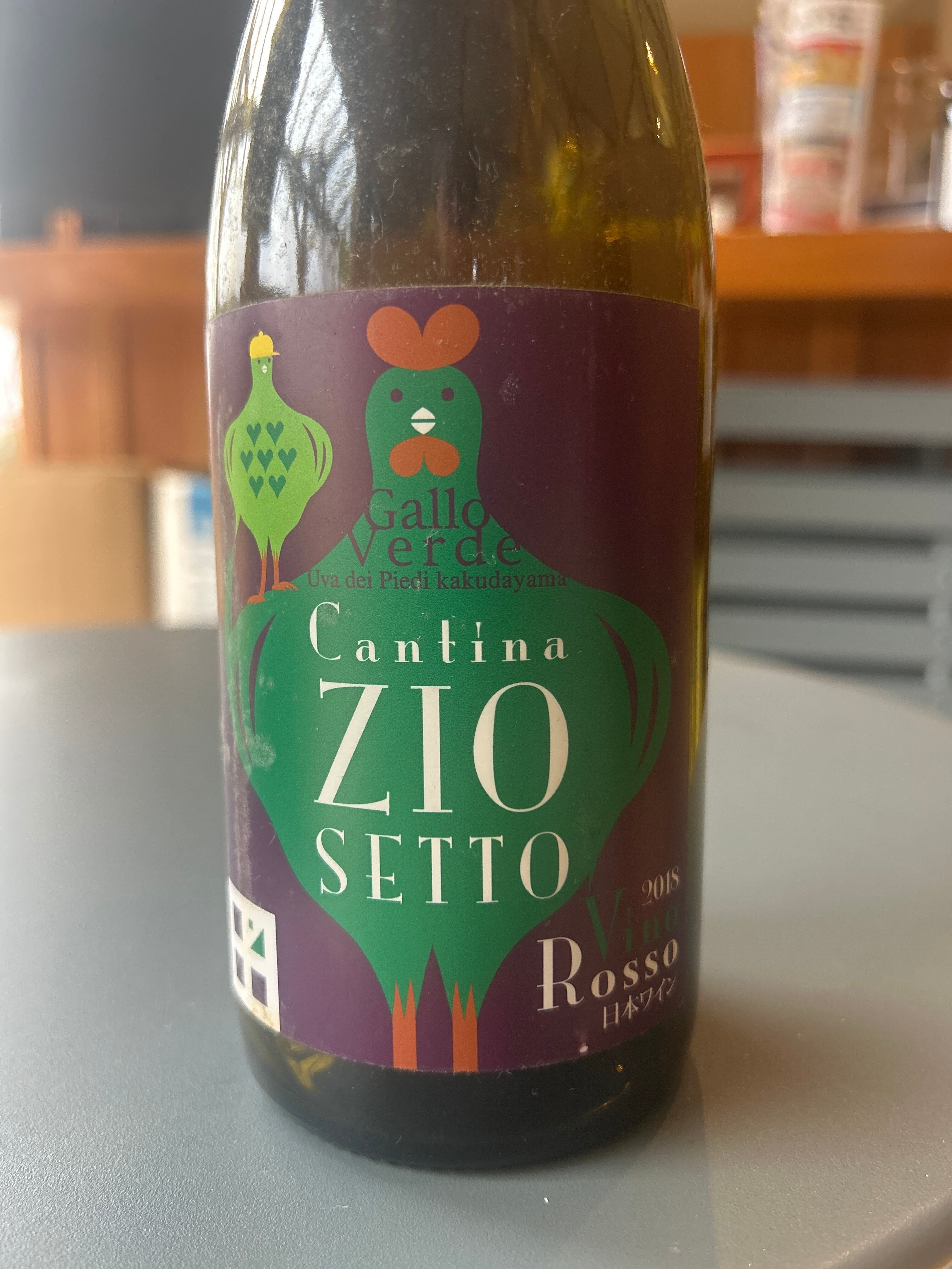 新潟市在住、石川経治さんによるもの。2014年からは地元の小学校と収穫を始めたことを記録するために雄鶏の右肩に小さなニワトリがのる。黄色い帽子は手伝ってくれた小学生を表し、胸のハートの数は6年生の生徒数を表す。作業の御礼として8年後(12歳+8年=20歳)にひとり1本のワインをお渡しする。伝統的なワイン産地が地元から製造や栽培に関わる人材を輩出するように、将来この地もそうなって欲しいとの願いを込めた。