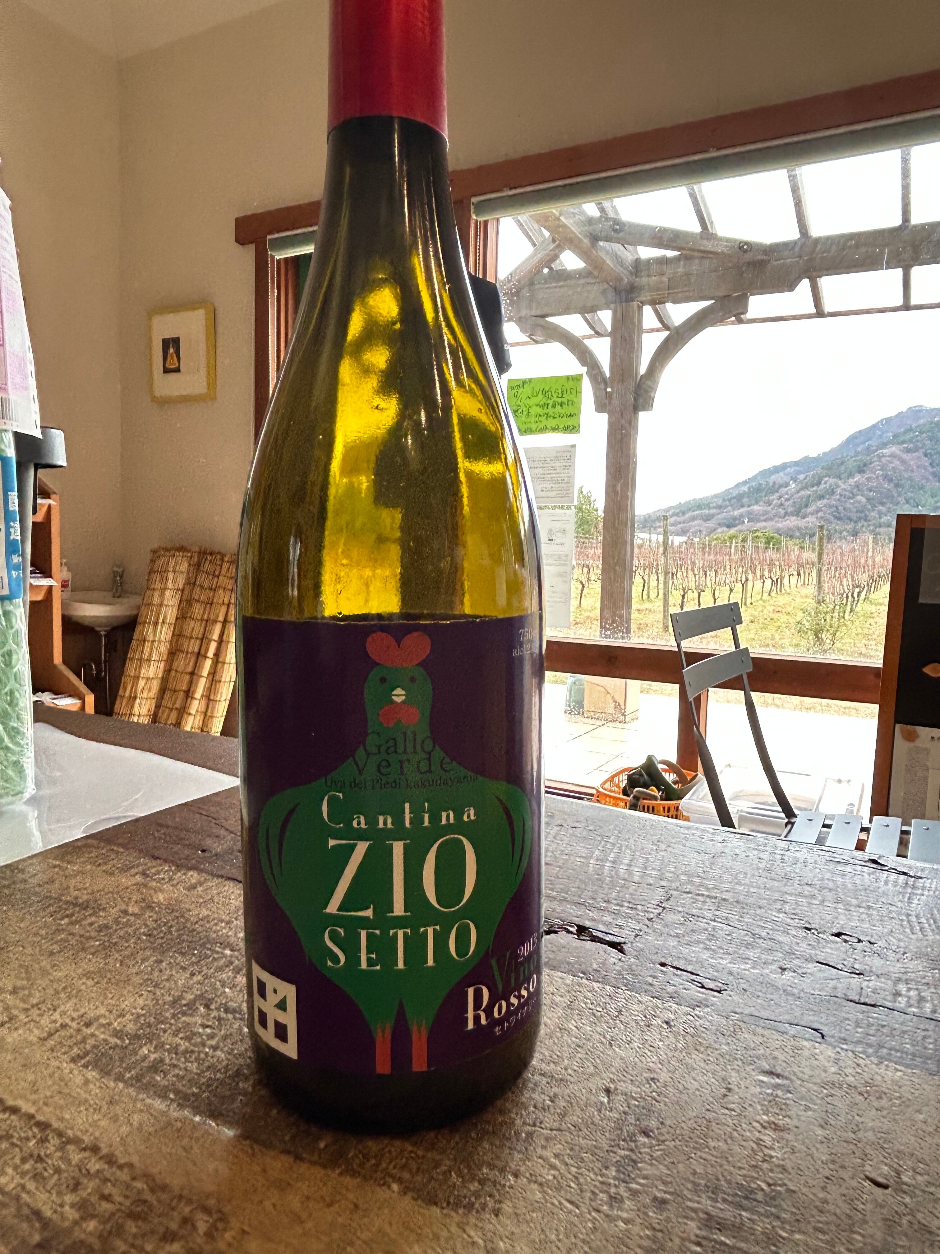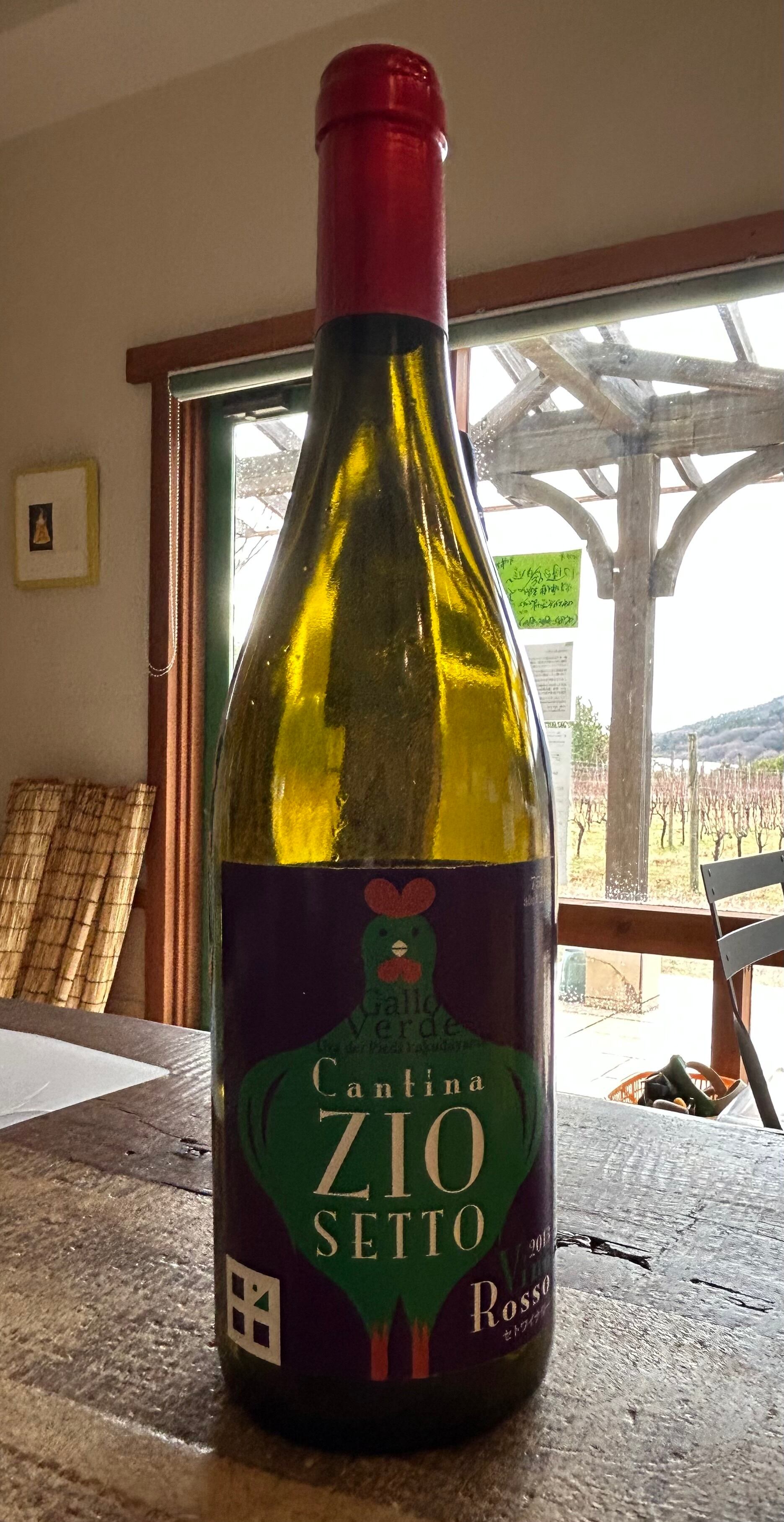 新潟市在住、石川経治さんによるもの。2014年からは地元の小学校と収穫を始めたことを記録するために雄鶏の右肩に小さなニワトリがのる。黄色い帽子は手伝ってくれた小学生を表し、胸のハートの数は6年生の生徒数を表す。作業の御礼として8年後(12歳+8年=20歳)にひとり1本のワインをお渡しする。伝統的なワイン産地が地元から製造や栽培に関わる人材を輩出するように、将来この地もそうなって欲しいとの願いを込めた。